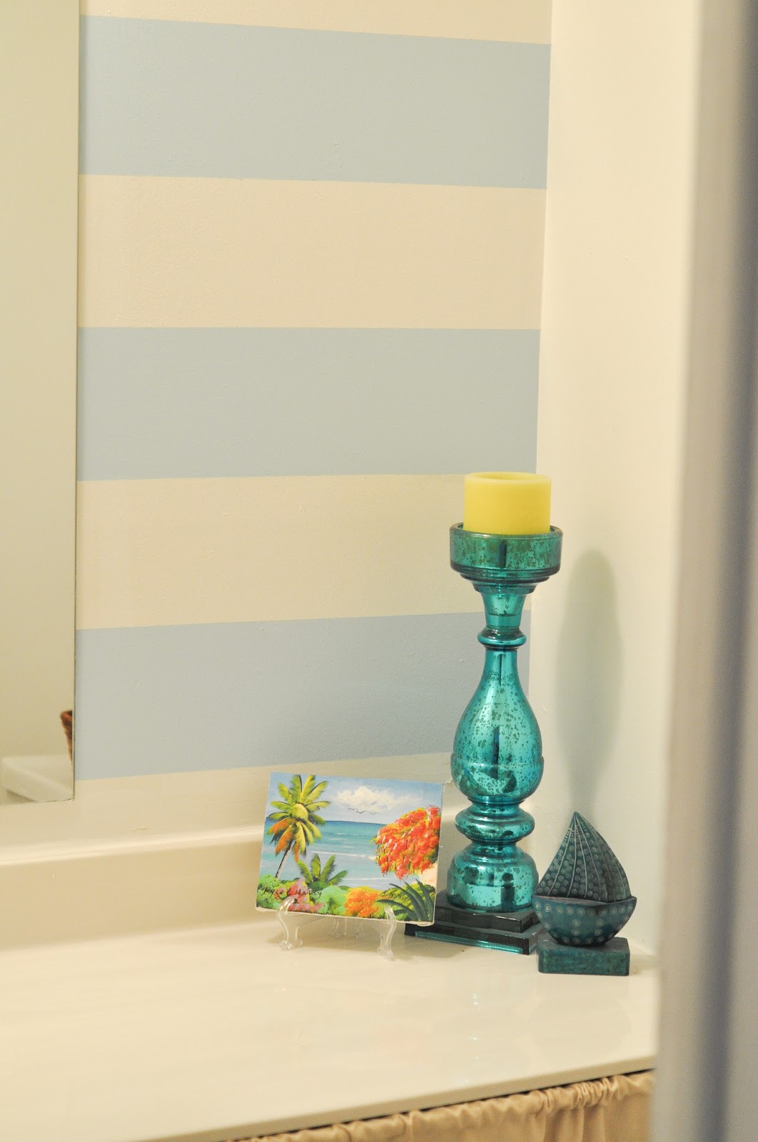 I love this little bathroom ... but it's far from where I want it to be... I painted the stripes on the wall using an "oops" sample color from home depot. SO cute, SO cheap (only cost me $.50 - can't beat that)... I have plans for the rest of the walls and some much cuter decor.. but this is where it's been since we moved in... work in progress people, work in progress..